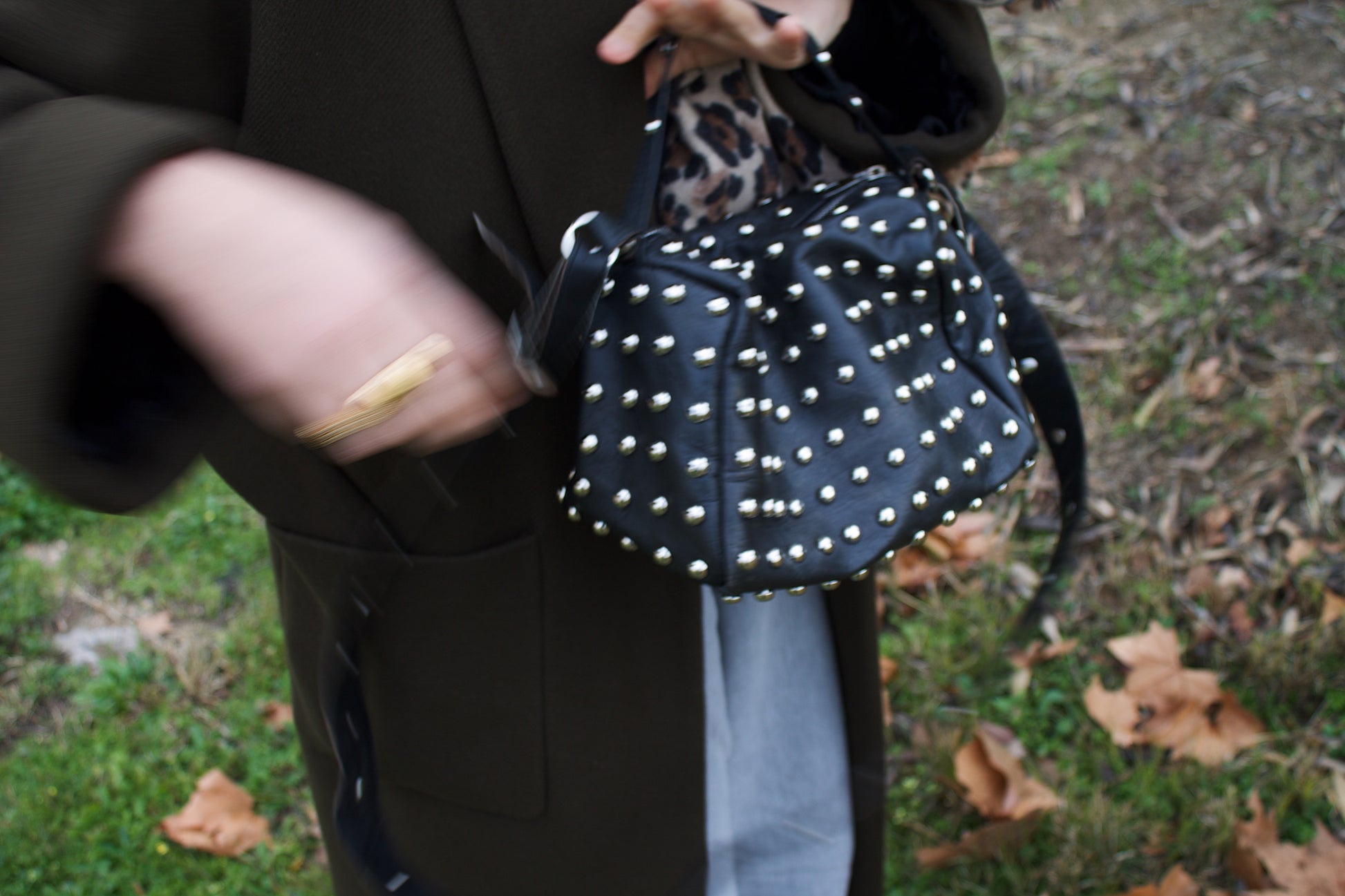 Adornado con tachuelas en toda su superficie, cuenta con una cremallera principal que cierra el bolso por completo, garantizando seguridad para tus pertenencias. Su interior, forrado en ante, incluye un práctico bolsillo con cremallera. Además, dispone de dos correas: una corta fija y otra larga desmontable para mayor versatilidad.