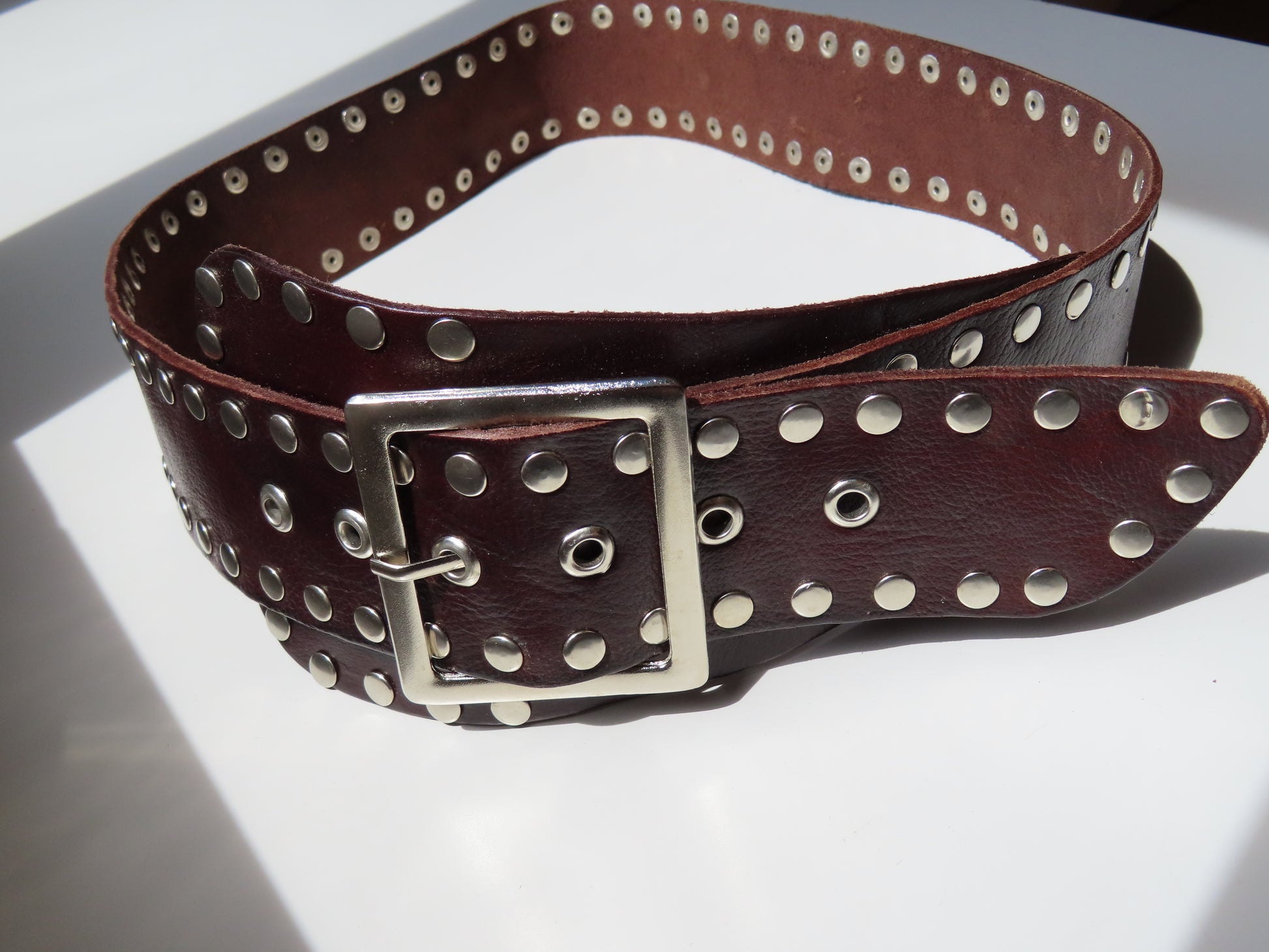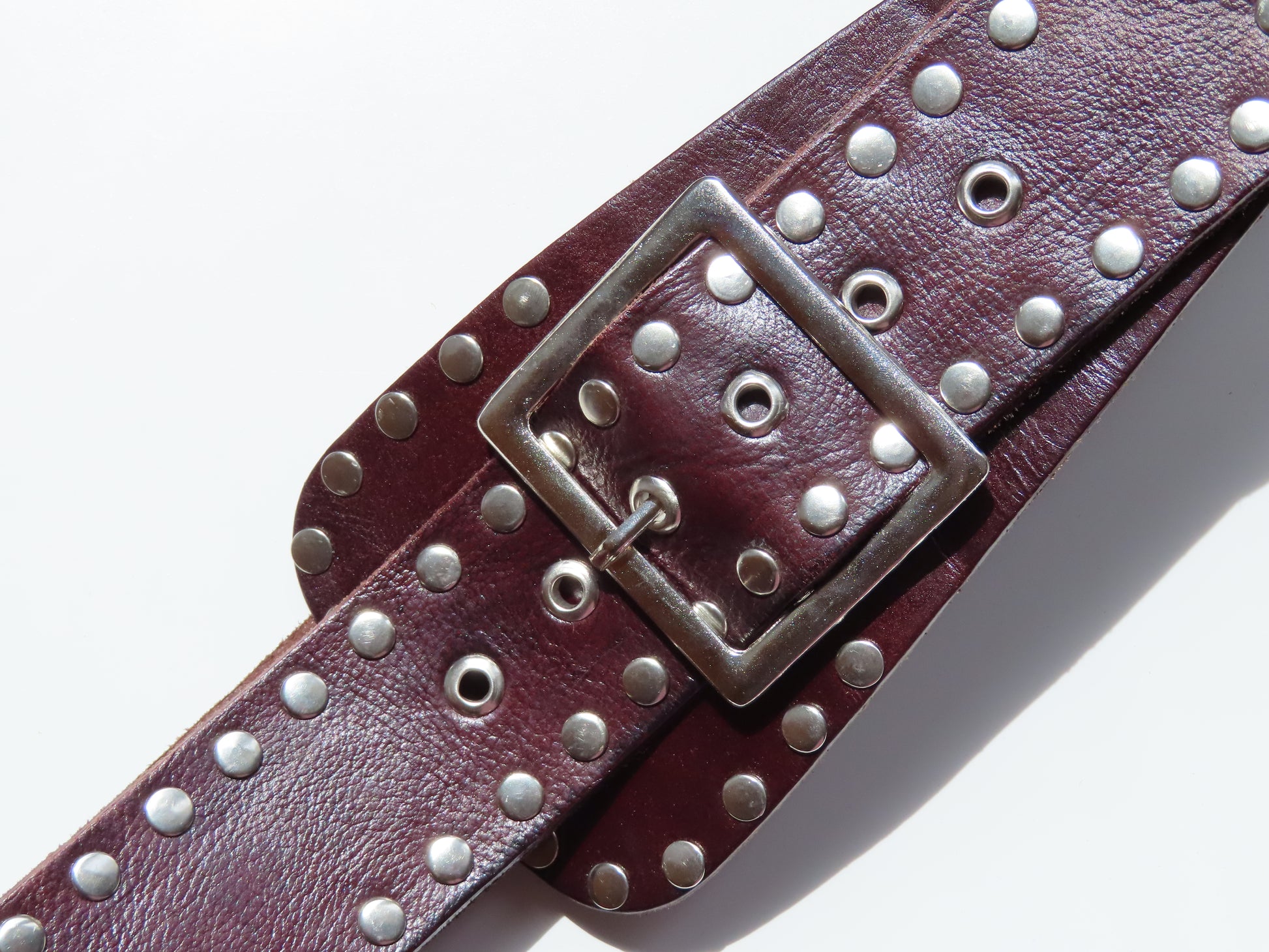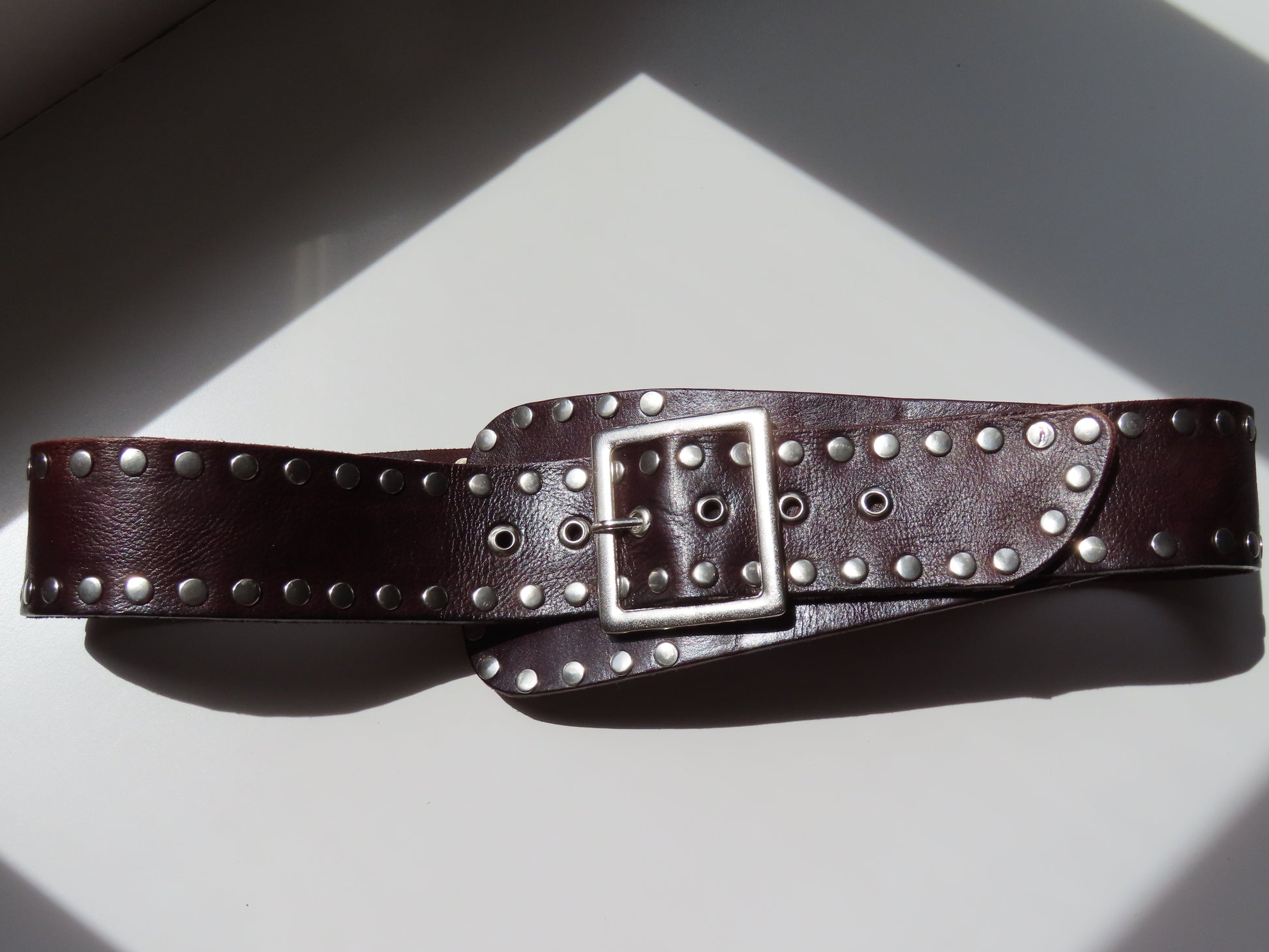 Cinturón ancho de cuero en color marrón. Decorado con tachas metálicas plateadas a lo largo de toda la superficie, que le aportan un estilo atrevido y con carácter.