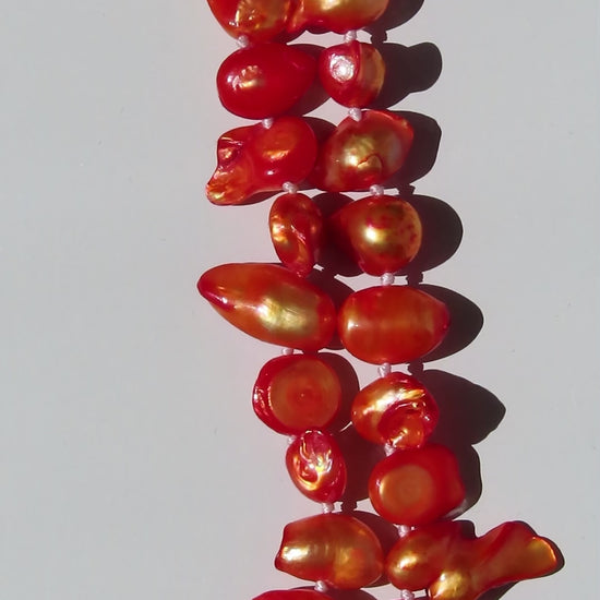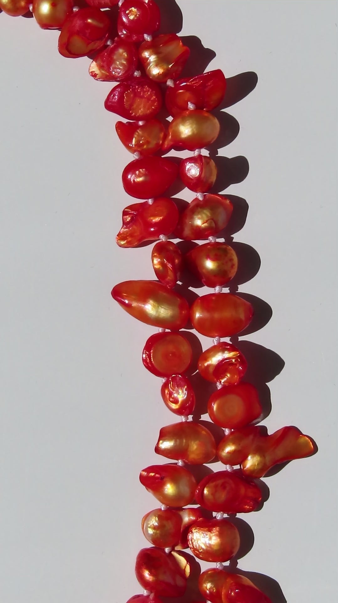 Collar de piedras con forma irregular, lo que hace que cada pieza sea única. Abalorios en tonos naranjas con reflejos.